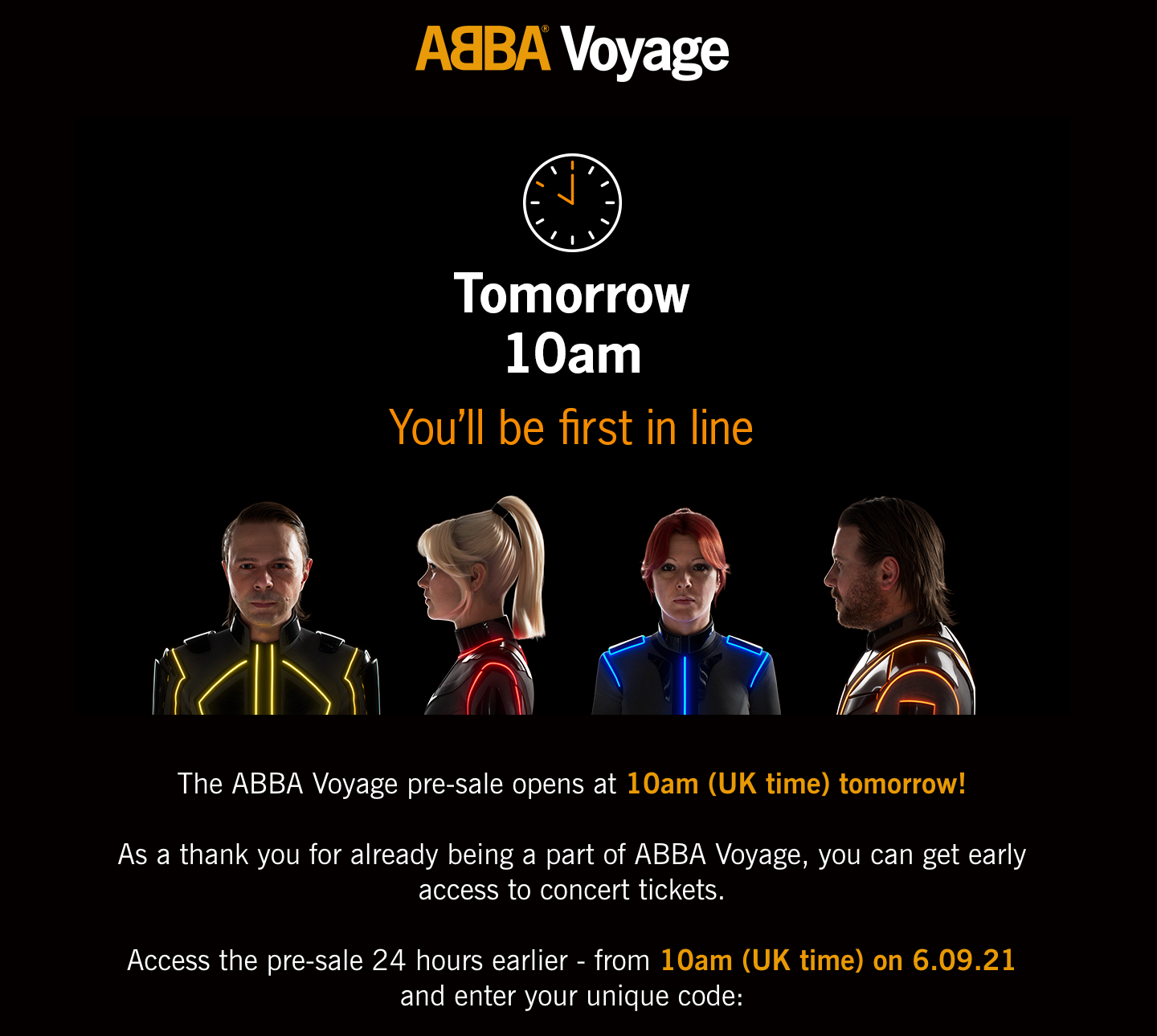 40 years in the making, an exciting launch campaign to let people know how they could be first in line for ABBA Voyage concert tickets. We created several complex email marketing campaigns, website content, out of home assets, and a cross-agency tone of voice document. Puns were involved.